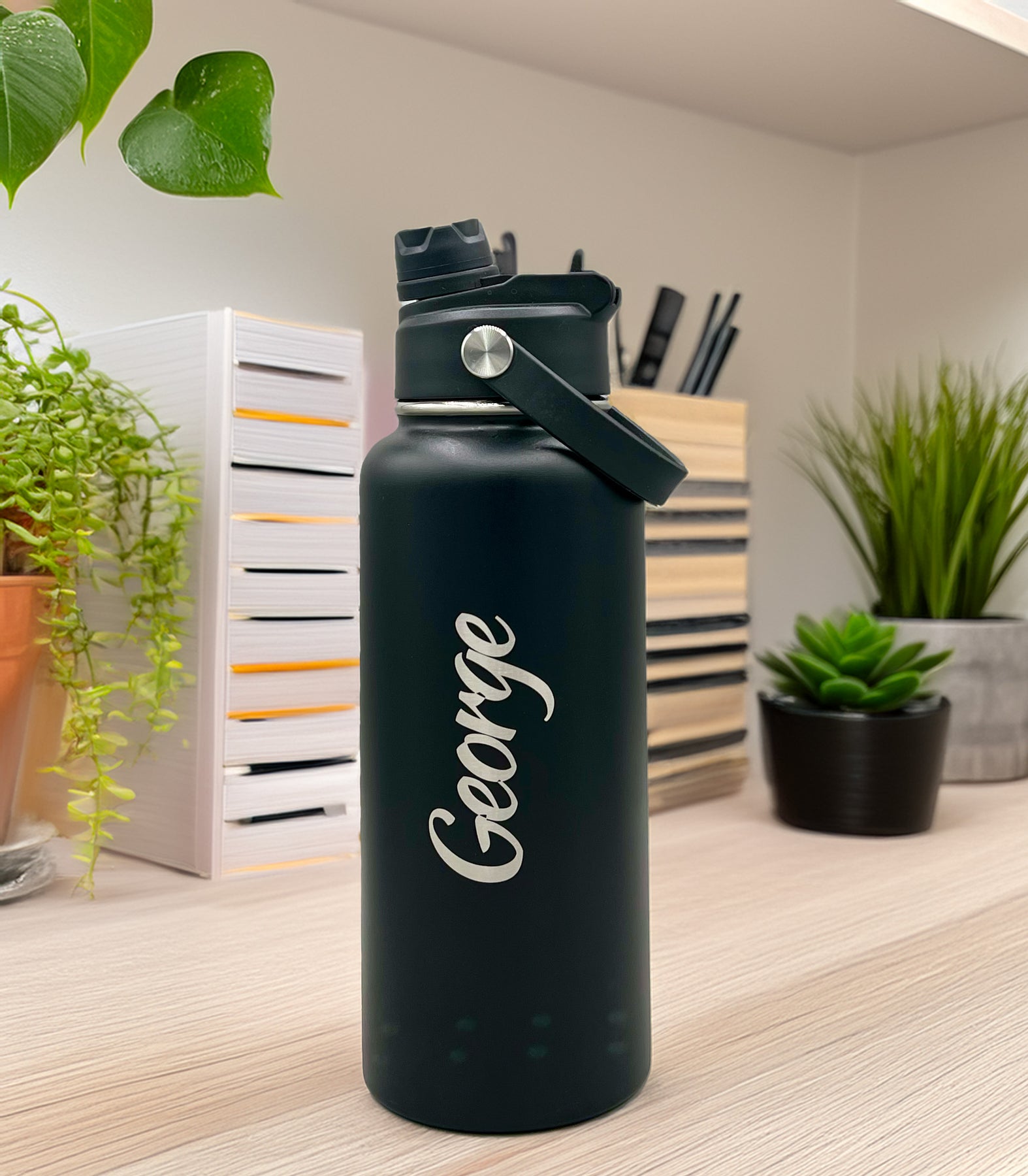 This 32oz water bottle features advanced double-wall vacuum insulation to keep your drinks cold for 24 hours or hot for 8 hours. Its sleek flat black powder-coated finish adds durability and a secure grip. The versatile dual lid offers both a straw spout for easy sipping and a wide-mouth chug spout for quick drinking, perfect for any activity. With a handy carrying handle and BPA-free design, it’s ideal for daily use or outdoor adventures. Packaged in a stylish window gift box, this bottle combines functionality with a modern look you'll love.